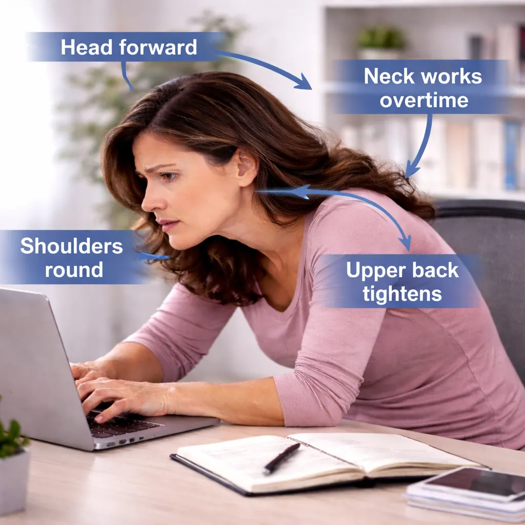 head forward → shoulders round → upper back tightens → neck works overtime
